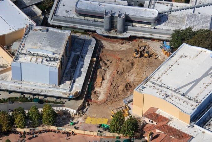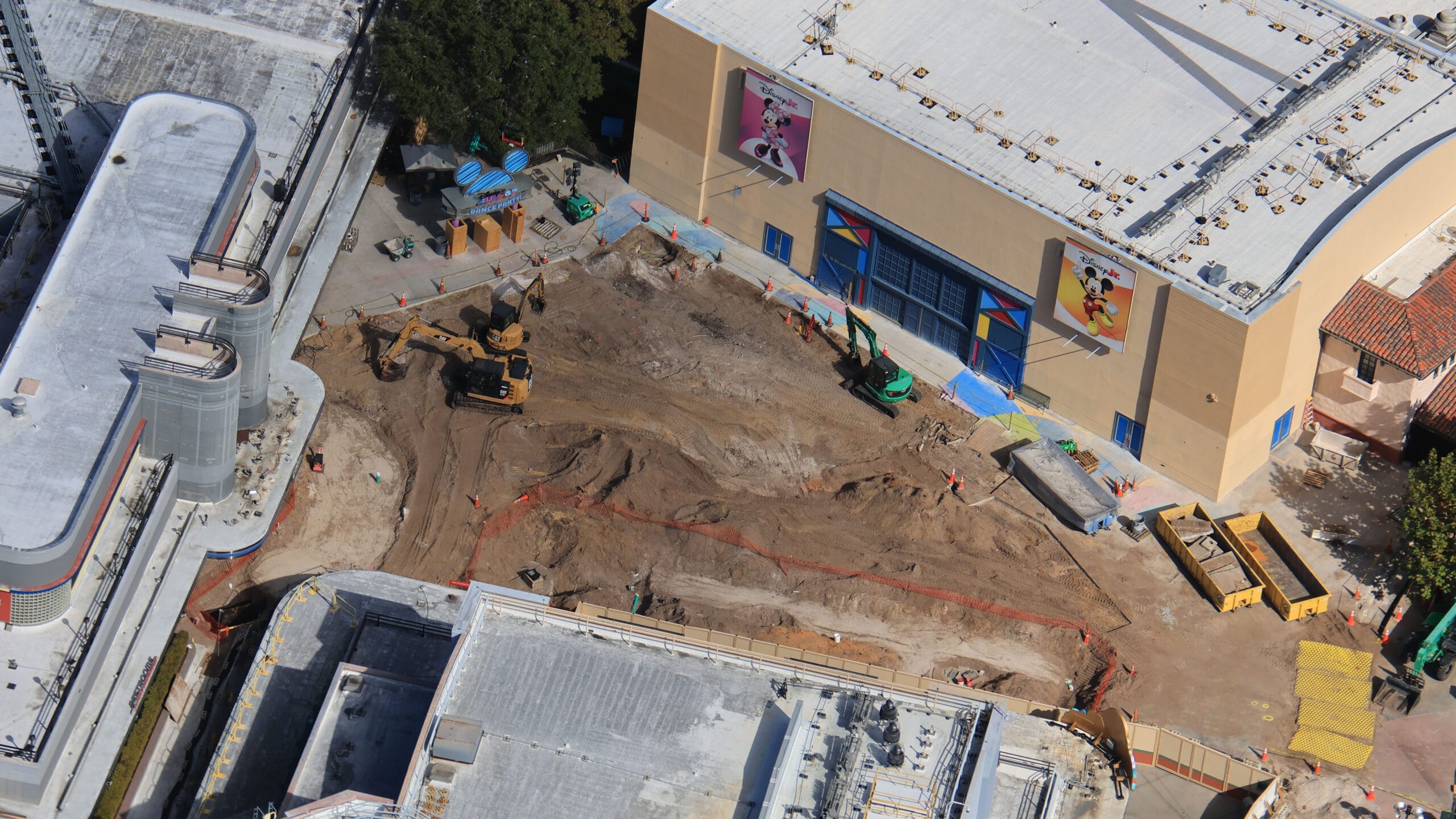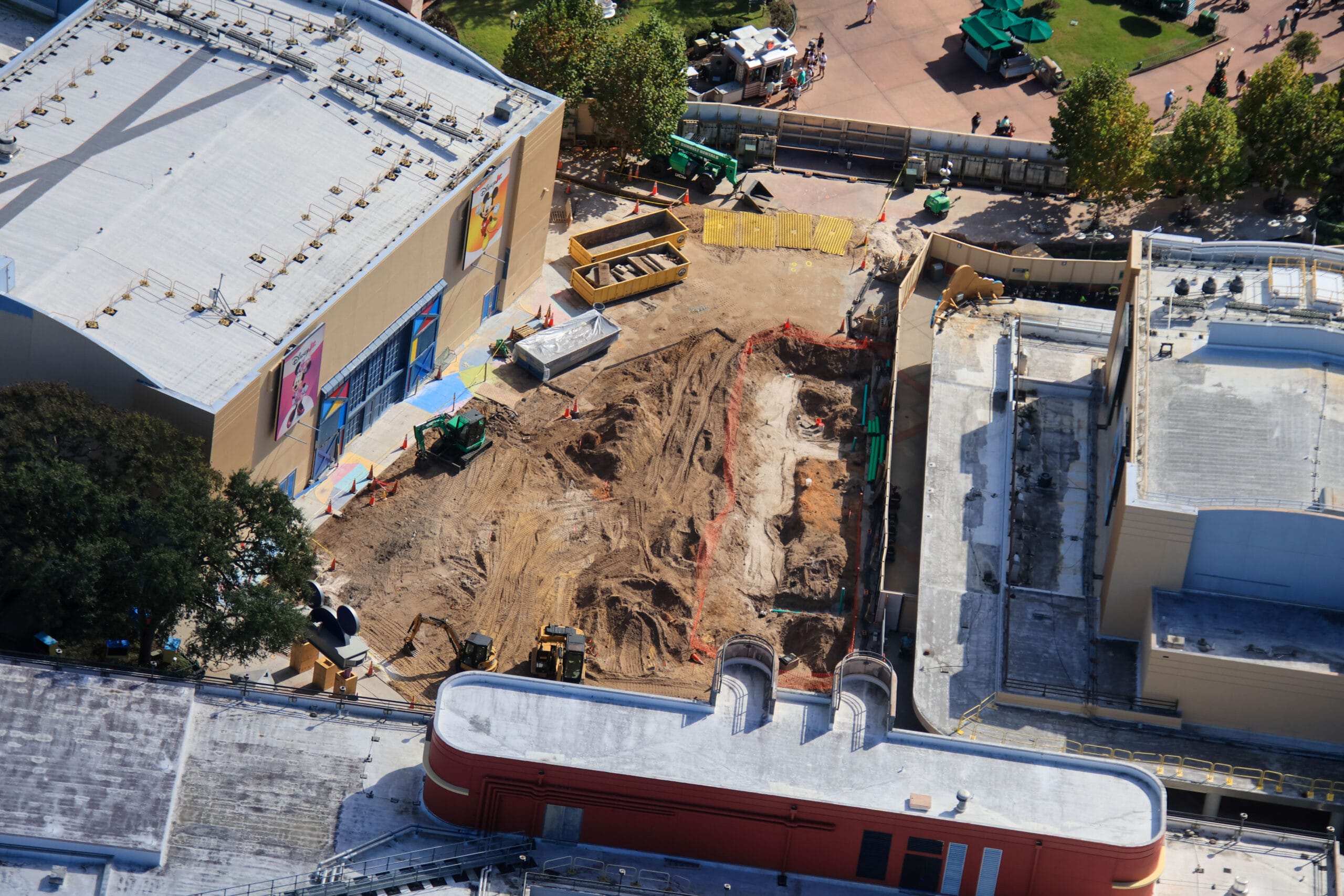 کارهای ساخت‌وساز که بین ساختمان‌های نمایش انجام می‌شود، نشان می‌دهند که زمین در محل ورودی قبلی پاک‌سازی می‌شود. می‌توانید ورودی جاذبه بازی و رقص Disney Junior را در سمت چپ تصویر بالا ببینید.