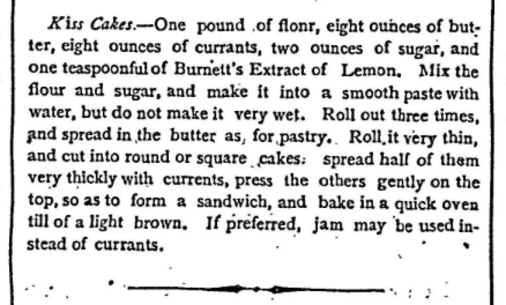 دستور کیک بوسه‌دار، که در سال ۱۸۸۵ در سالت لیک سیتی منتشر شد.