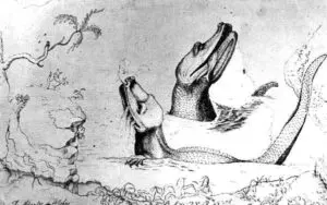 نقاشی بارترام از دو تمساح در رودخانهٔ سنت‑جانز توسط کتابخانه و آرشیو ایالت فلوریدا