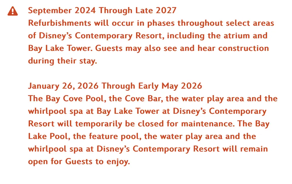 بازسازیها بهصورت مرحلهای در برخی مناطق منتخب هتل معاصر دیزنی، از جمله آتریوم و برج بی لیک، انجام میشود. مهمانان ممکن است در طول اقامت خود صداها و نماهای ساختوساز را ببینند و بشنوند.