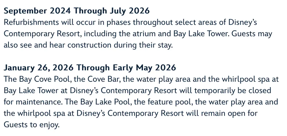 استخر بی کوو، بار کوو، ناحیه بازی آب و اسپا چرخشی در برج بی لیک هتل معاصر دیزنی موقتاً برای تعمیرات بسته خواهند شد. استخر بی لیک، استخر اصلی، ناحیه بازی آب و اسپا چرخشی در هتل معاصر دیزنی برای مهمانان باز خواهد ماند تا از آن لذت ببرند.