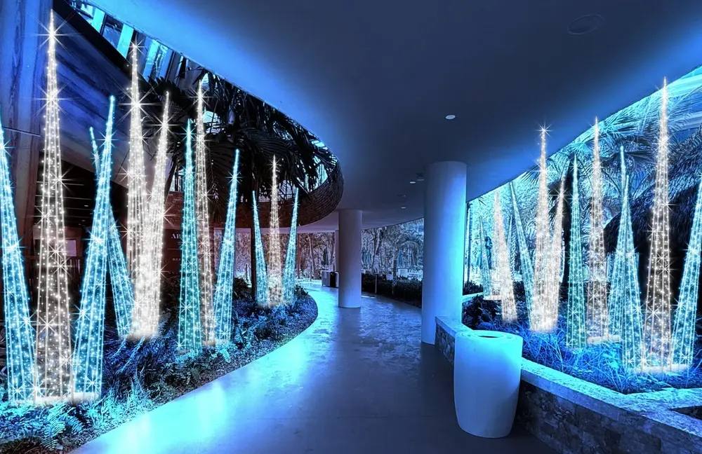 تونلهای درخشان مسیر قطب شمال را احاطه میکنند؛ مجسمههای با رنگ سرد نمایش «شعلۀ یخزده» را شکل میدهند؛ و «سفر آسمانی سانتا» آسمان شب را با بیش از ۱۰۰ کرهٔ درخشان روشن میسازد. بازدیدکنندگان میتوانند در میان درختان براق یخی «جنگل کریستالی» قدم بزنند، در «خیابان پرترههای تعطیلات» عکسهای جشنوارهای بگیرند یا از قوسهای نورانی «بلوار نور ستارگان» لذت ببرند.