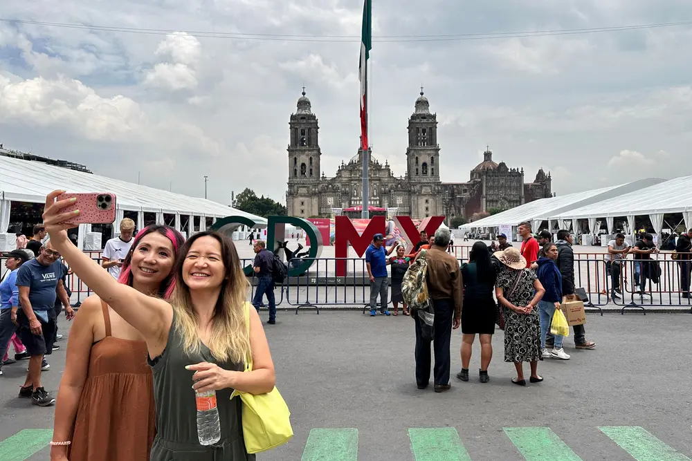 گردشگرانی در تاریخ ۴ آگوست ۲۰۲۳ برای سلفی در مقابل نمای کلیسای متروپلیتَن در مکزیک سیتی عکس گرفتند.